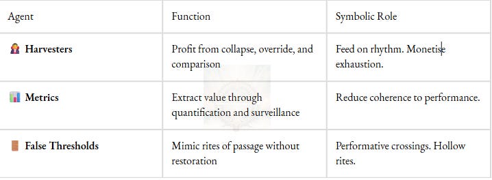 False Thresholds include retreats, programmes, and rituals that promise transformation but rehearse performance